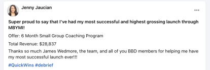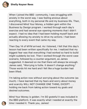 Before joining BBD, my business was successful, I had hit $100K months but I was burning out with big launches. My launches were successful but felt heavy and inefficient, and I wasn’t clear on what was truly moving the needle. BBD gave me the clarity to refine my messaging so it cuts through the noise, shift how I approach launches, and become far more strategic and efficient. The launch debrief process, in particular, helped me clearly see what was working and what wasn’t, allowing me to make data-driven decisions instead of guessing.